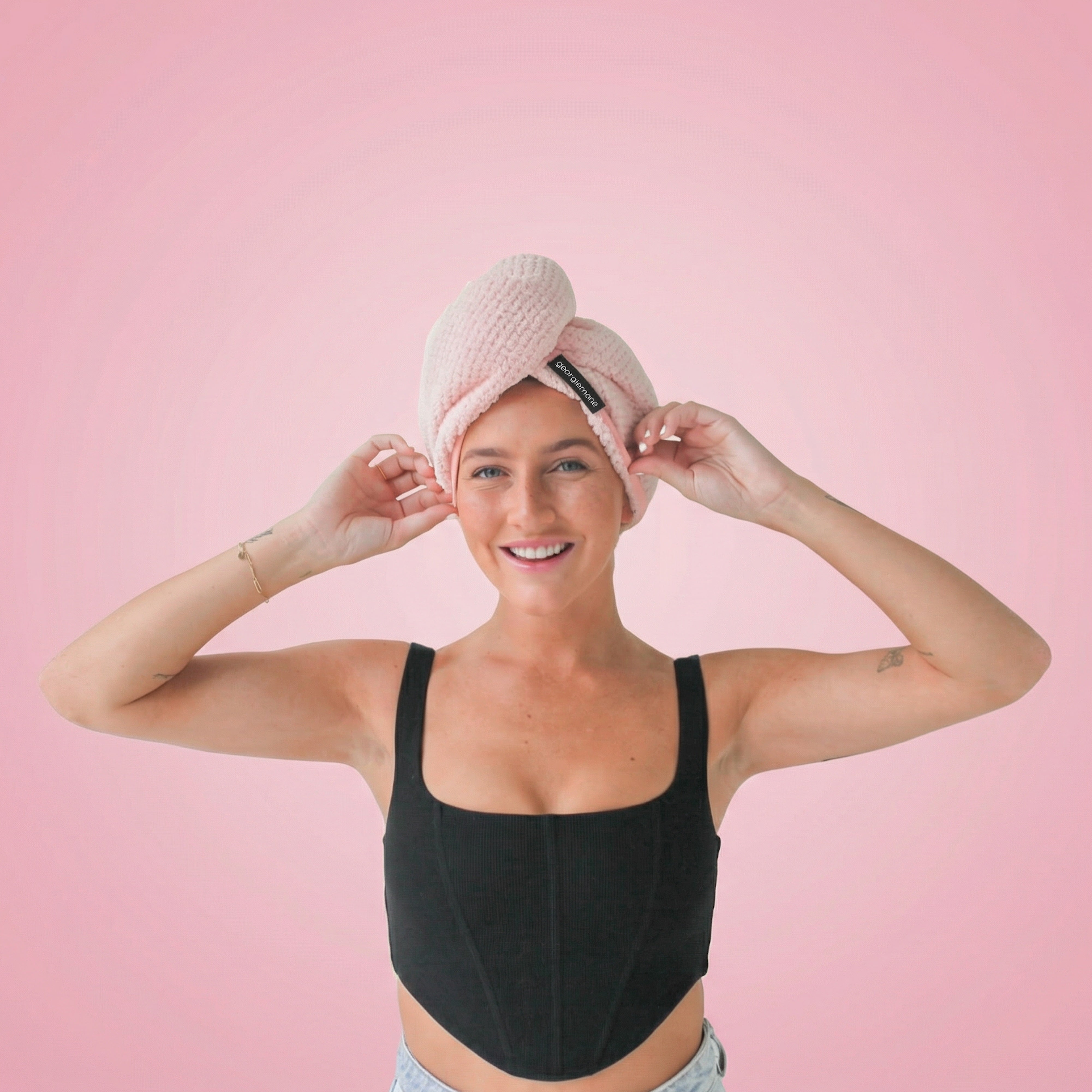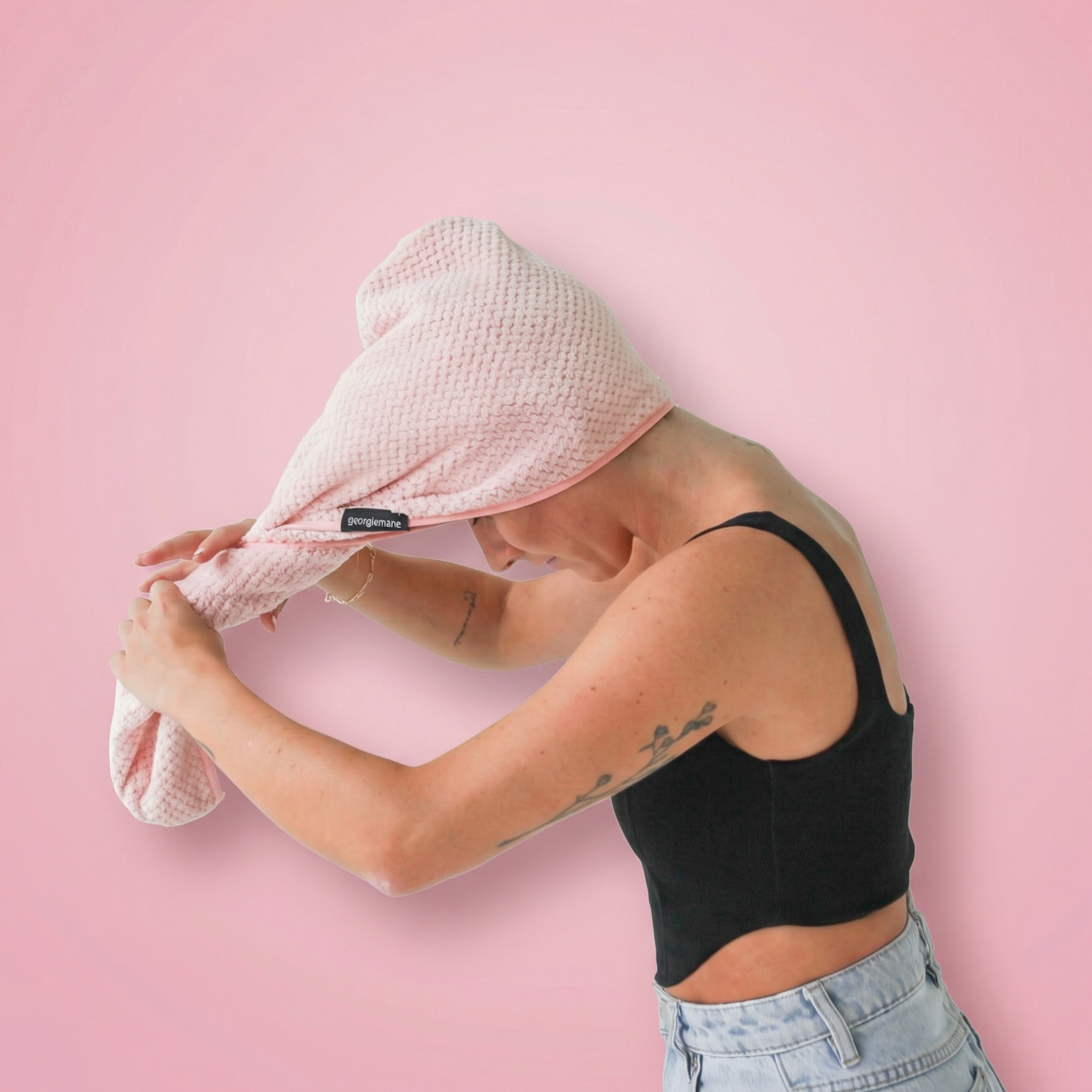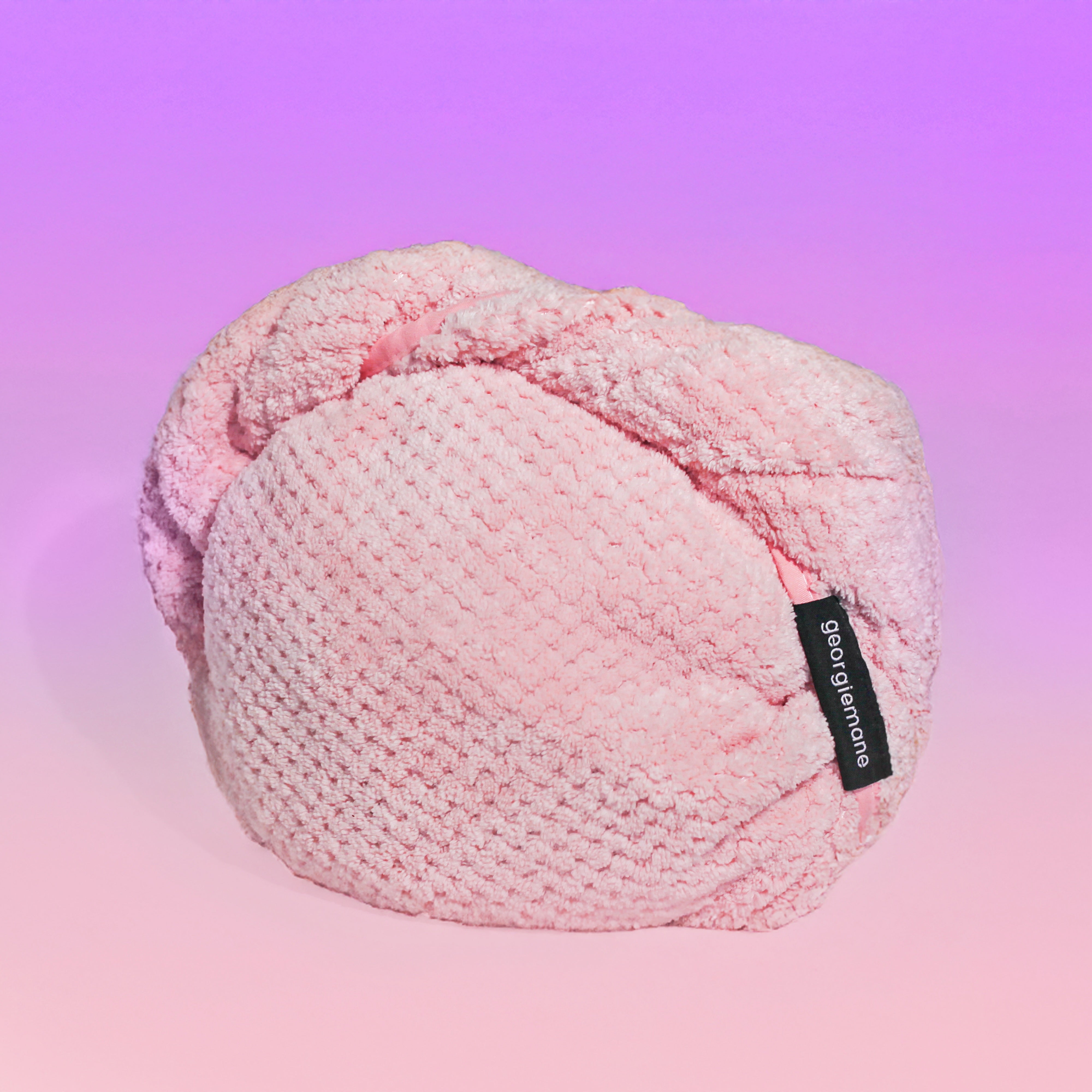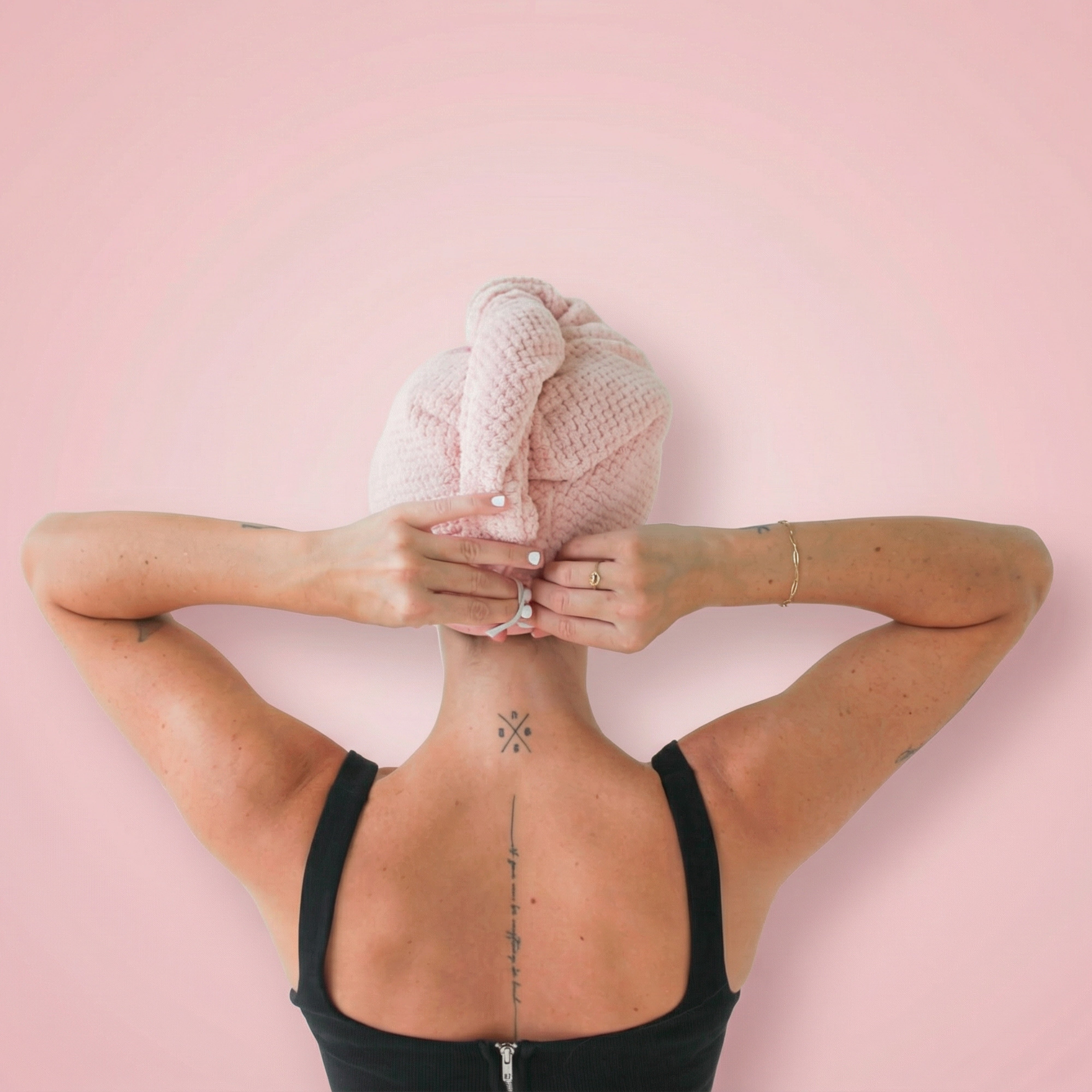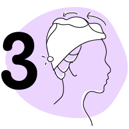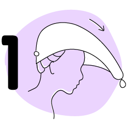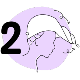 flip head forward and place the towel wrap on your freshly washed or masked hair, with the button on the rear of the head